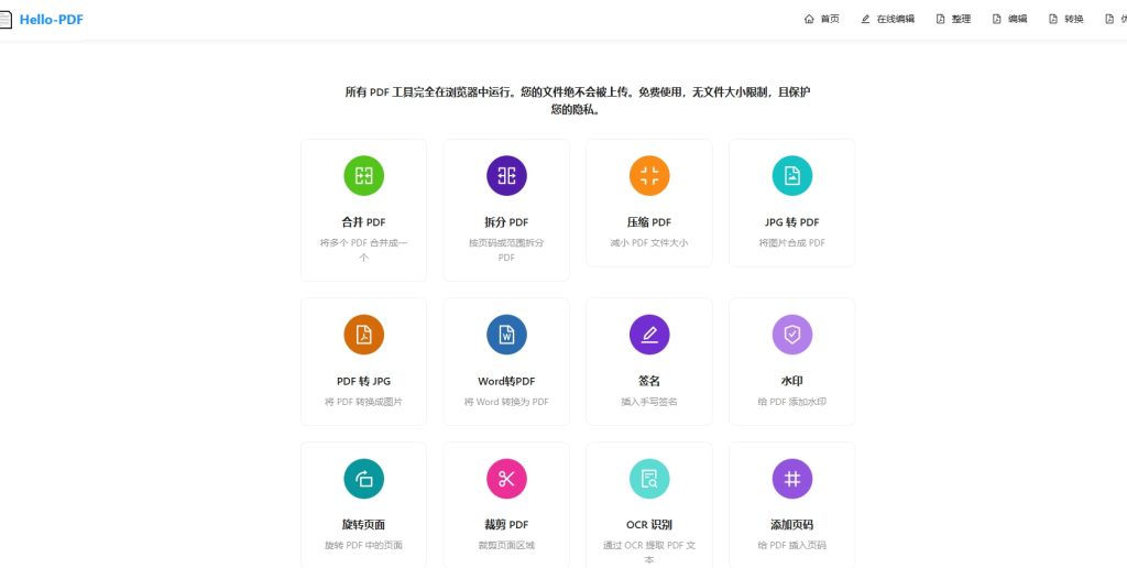 在线 PDF 工具箱,支持合并、拆分、压缩、签名、水印、旋转、裁剪、OCR 识别、加密解密、删除页面等。