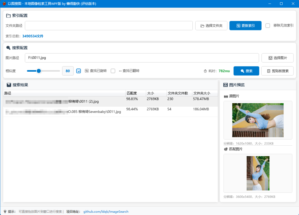 一个基于本地硬盘的以图搜图小工具,可实现百万图片毫秒级检索,支持 jpg、png、bmp、gif 相互检索,首次使用需要先进行一次较长时间的更新索引。